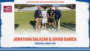 The NCHSAA is committed to recognizing outstanding sportsmanship in each of our State Championship events. The Association has partnered with the North Carolina Farm Bureau to award a pair of Sportsmanship Awards at each championship event, recognizing players who have demonstrated the ideals of outstanding character and sportsmanship throughout the 2024 season. The winners of the 1A Men’s Soccer NC Farm Bureau Sportsmanship Awards were David Garcia from Mount Airy and Jonathan Salazar from Hobbton.