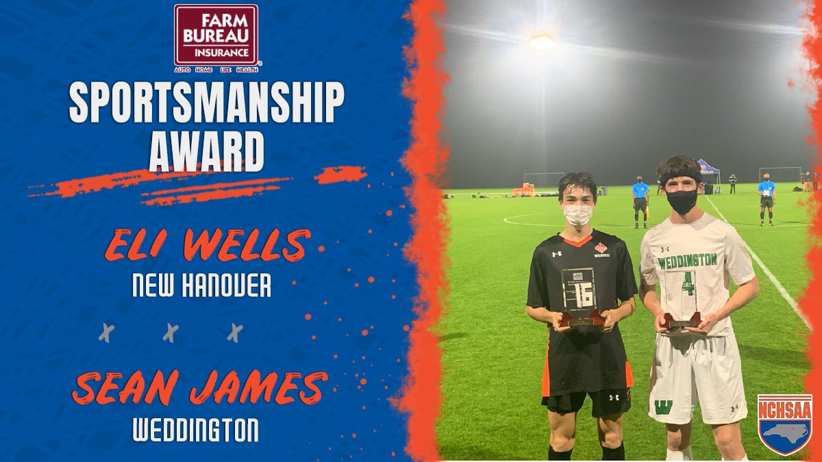 The NCHSAA is committed to highlighting and promoting outstanding sportsmanship. The Association has partnered with NC Farm Bureau to recognize one individual from each participating team in an NCHSAA State Championship who has demonstrated exemplary sportsmanship throughout the year. This year’s winners of the NC Farm Bureau Sportsmanship Awards for the 4A Men’s Soccer Championship are Sean James from Weddington and Eli Wells from New Hanover.