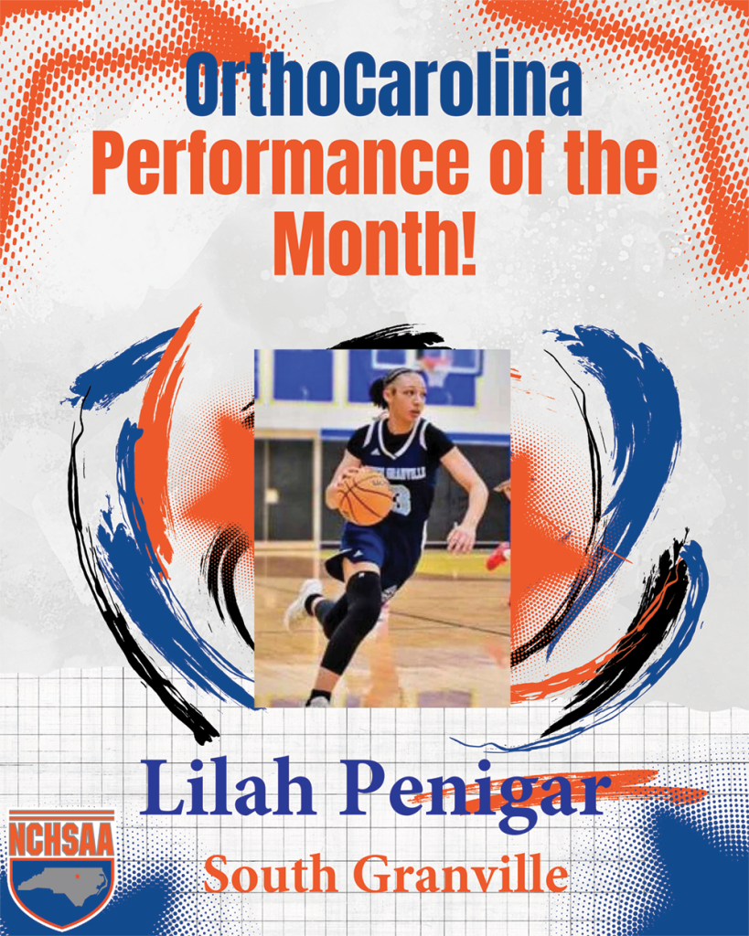 The Female Performance of the Month award goes to Lilah Penigar from South Granville The junior guard averaged 38 points and 13 rebounds per game in the month of February. She scored more than 40 four times, including dropping 51 against Carrboro on the 12th. Lilah was selected as the player of the year for the Big Seven Conference.