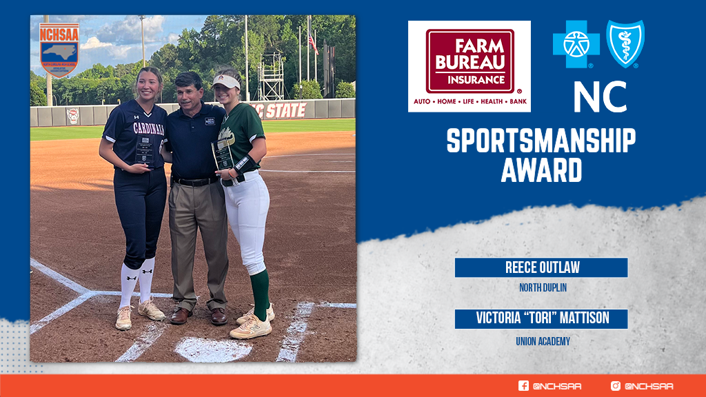 The NCHSAA is committed to recognizing and promoting good sportsmanship and has partnered with the NC Farm Bureau to honor two student-athletes at each of this year’s championships with Sportsmanship Awards for excellence throughout the season. The 4A Softball Sportsmanship Award winners were Grace Bechtol from Hickory Ridge and Kathryn Curry from Apex.