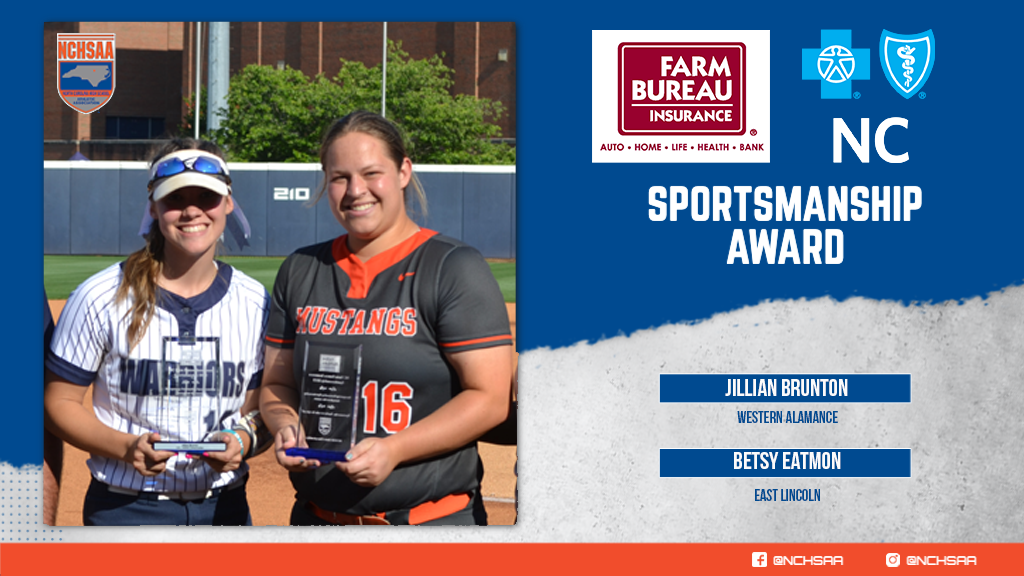 The NCHSAA is committed to recognizing and promoting good sportsmanship and has partnered with the NC Farm Bureau to honor two student-athletes at each of this year’s championships with Sportsmanship Awards for excellence throughout the season. The 3A Softball Sportsmanship Award winners were Jillian Brunton from Western Alamance and Betsy Eatmon from East Lincoln