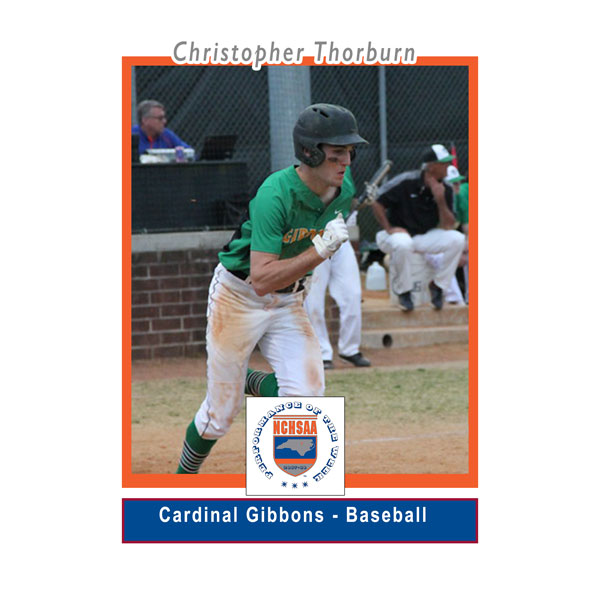 Thorburn, a senior on the Cardinal Gibbons baseball team, had a phenomenal outing in the Crusaders 20-4 win versus Garner. In the second inning, Thorburn belted two home runs, which enters him into the NCHSAA record book as the 15th student-athlete to hit 2 home runs in an inning. Thorburn finished the game with 3 hits and 8 RBIs.